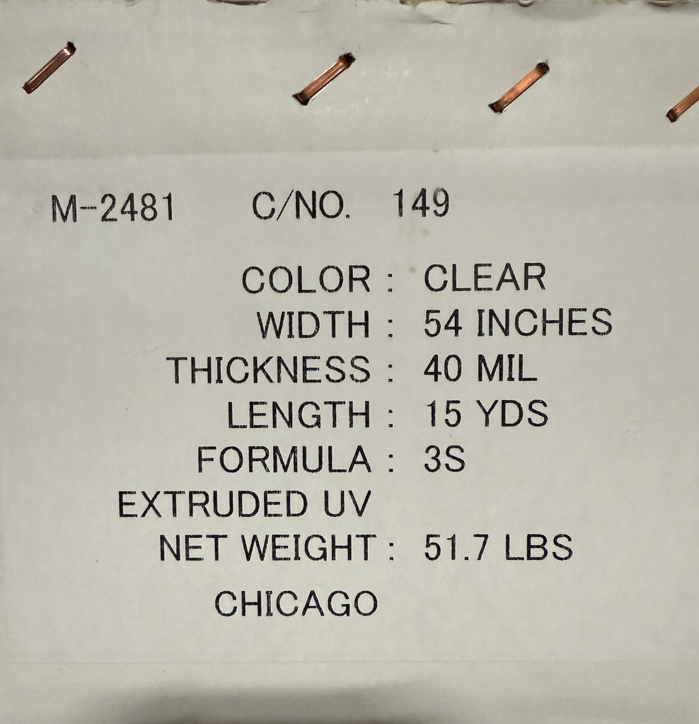 Robeco’s 40 gauge (heavy duty) clear vinyl is engineered for performance and versatility. This flexible, UV-resistant material provides excellent clarity and long-lasting durability. Ideal for marine windows, industrial curtains, covers, and protective applications. Sold by the yard or by the 15 yard roll to fit any project scale. || Contact us about volume price discounts for this product!!!